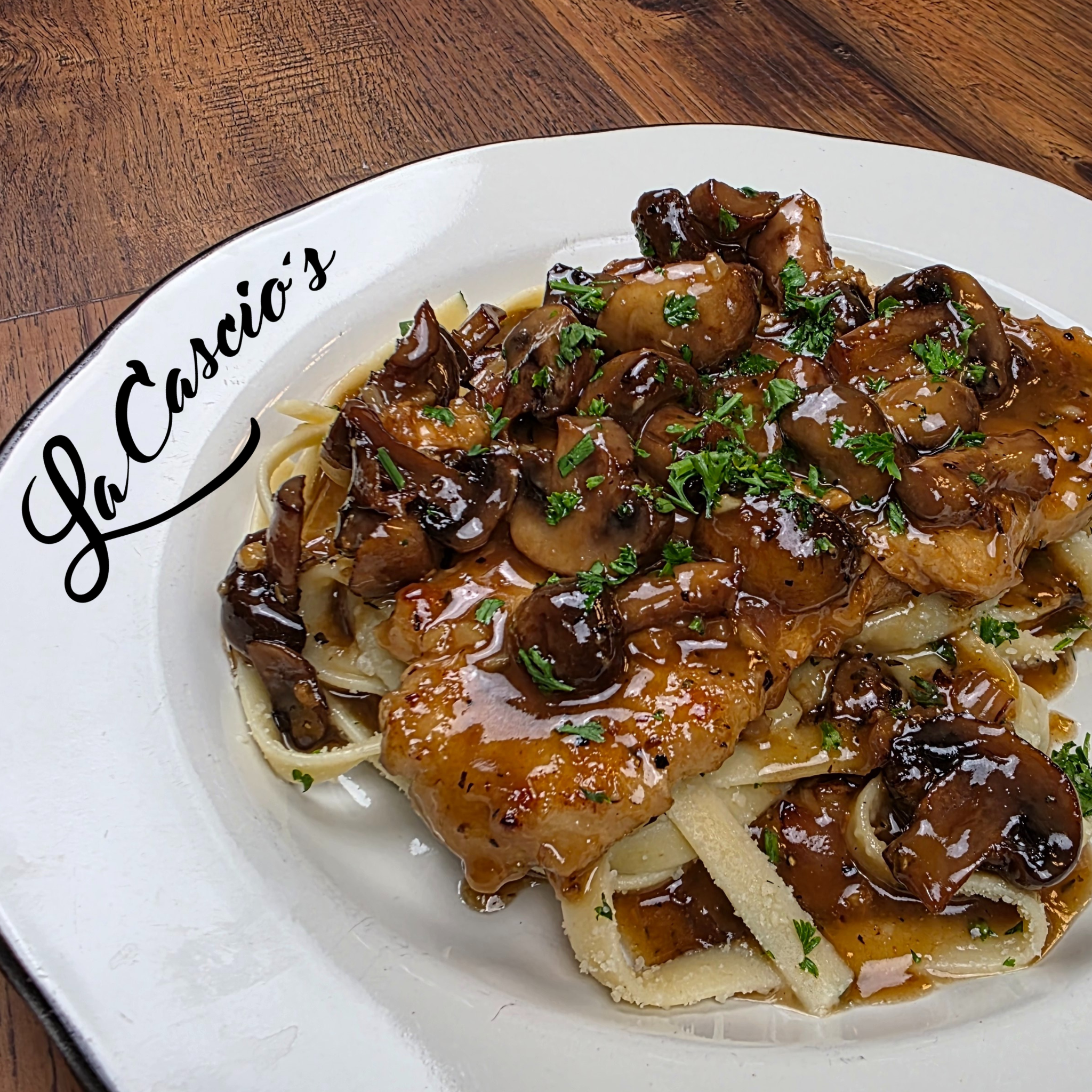 Pan seared with mushrooms, shallots, sweet marsala wine, grass fed butter, fettuccini – served with LaCascio’s fresh baked bread